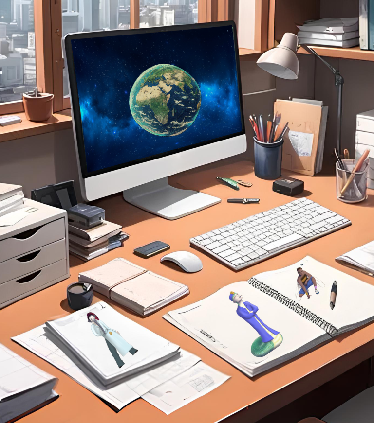 הרקע נוצר באמצעות בינה מלאכותית ו"טיפול" בפוטושופ, כאשר הוטמעו בו פרטים נוספים המשדרגים את החוויה כמו הדמויות במחברת, ומסך הבית במחשב.