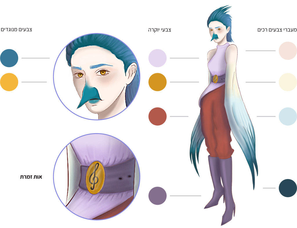 תהליך הצביעה התחיל מפניה של הדמות. הצבעים המנוגדים בין העיניים הכתומות לבין הטורקיז מבליטים את עיניה ומבטה החודר. בגדיה נצבעו בצבעים המשדרים יוקרה – אדום, סגול וצהוב – וממצבים אותה כזמרת נעלה. הגוונים הרכים שומרים על אופיה המרגיע, ואווירת הפנזטיה משתקפת ע"י קשת הצבעים הרחבה ומעברי הצבע.